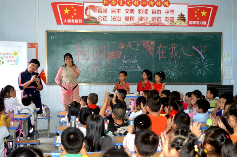 活动中周校长还和同学们一块庆祝,并应同学们邀请讲话,她勉励同学们,今天你们生活在祖国强大的美好时代,在美丽安静的校园学习,共同庆祝祖国母亲69岁生日,是多么的幸福!希望同学们从小养成好习惯、形成好品德,长大练就一身好本领,从小自觉培育和践行社会主义核心价值观,在星星火炬的照耀下,在党的阳光沐浴下,为实现中华民族伟大复兴的中国梦时刻准备着!