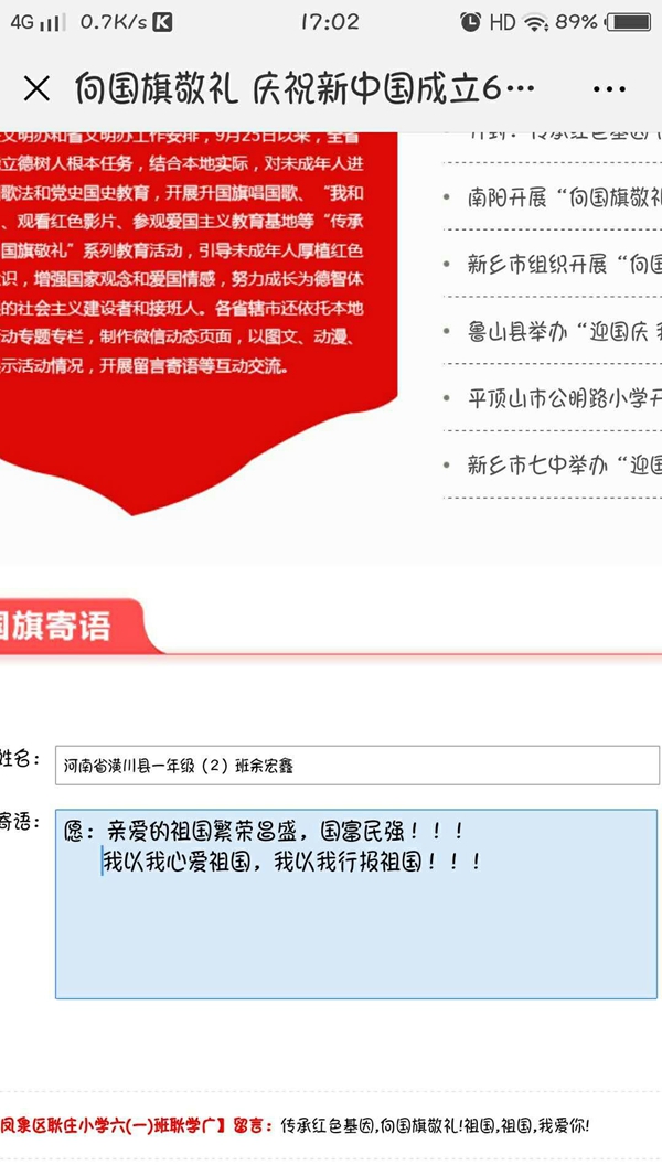 据悉,各班还参加了“向国旗敬礼”网上签名寄语活动、“向国旗敬礼”主题教育活动、“我和国旗合影”等活动,国庆放假期间每个学生还要开展“我与祖国合个影”照相、制作“我为祖国送祝福”手抄报”活动。一系列活动,不仅激发了孩子们的爱国情,更增强了同学们的报国志,同时锻炼了学生的主持、表演才能,更表达了逸夫小学全体师生的共同心愿:祝愿我们伟大的祖国早日实现“中国梦”!