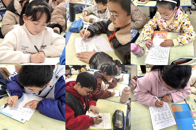 本次竞赛面向全体五、六年级学生,将近1400人参赛,比赛场地设在各班教室。比赛开始,只见参赛学生端坐在座位上,个个精神饱满,信心十足。首先是听写环节,广播中依次播放单词听力,学生们迅速在答题纸上写下对应的单词。随着比赛的深入,单词的难度逐渐加大,但孩子们依然镇定自若,奋笔疾书。