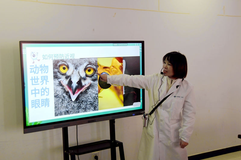 万新眼科的专业医生团队携带视力检测设备来到京学园林幼儿园。筛查开始前,万新眼科负责人采用PPT动画演讲的方式,向孩子们讲解为什么要做眼睛检查。随后,又通过列举生活中的常见场景,如看电视、玩游戏、看书等,深入浅出地阐述了不注意用眼卫生可能带来的危害,进而引出定期做眼睛检筛查的必要性。