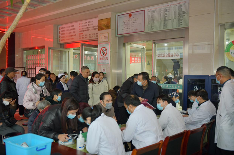 见面会后,湖北省人民医院(武汉大学人民医院)光谷院区胸外科主任黄杰、洪山院区眼耳鼻喉科主任杜磊、运动医学与关节外科骨外5科彭飞、洪山院区眼科杨扬、精神卫生中心谭广前往1号楼1楼大厅为群众义诊。