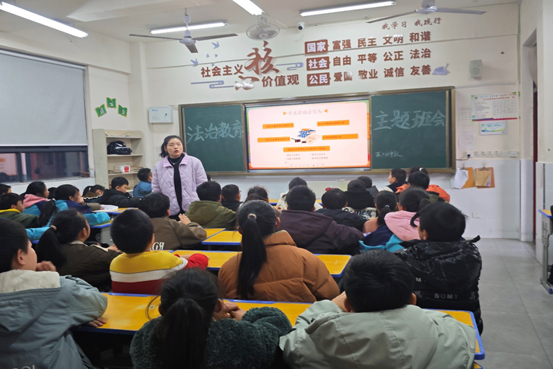 班会课上,中队辅导员从懂法知法做合格公民、遵法守法做合格学生、青少年与网络安全的探讨以及用智慧与法律保护自己的方法等几方面对学生进行教育,引导学生反思自己的行为及自身存在的不良习性,使学生深刻地认识到法治安全的重要性。大家纷纷表示要远离违法犯罪,争做文明学生。