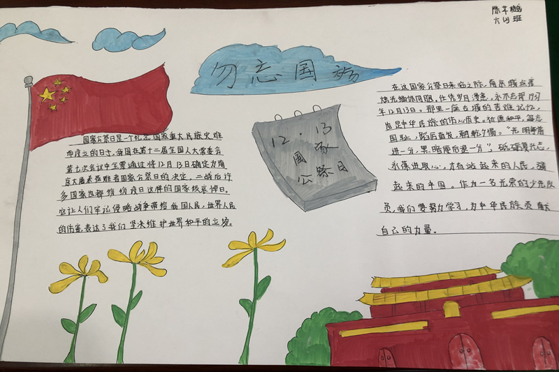 升旗结束后,各班级开展国家公祭日主题手抄报活动,同学们在回溯历史中表达哀思,激发爱国情怀,汲取前行的力量。