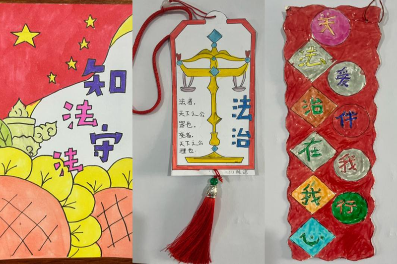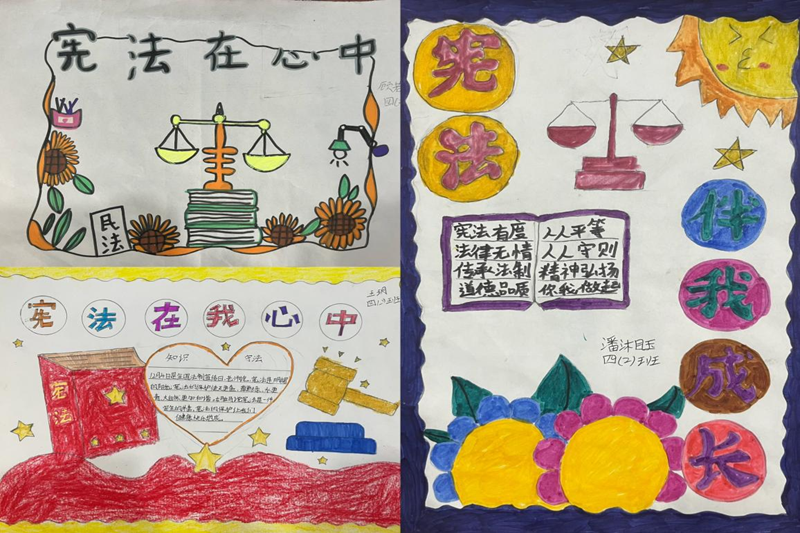 各年级精心设计,结合学生的认知特点,开展了形式丰富的活动。一、二年级的小朋友们在宪法知识手工制作活动中,通过亲手制作宪法书签和小旗帜,感受到了宪法的神圣与庄严。三、四年级的同学则通过宪法知识手抄报,将法治精神以创意的形式生动展现,宪法不再是书本上的文字,而是生活中的每个点滴。