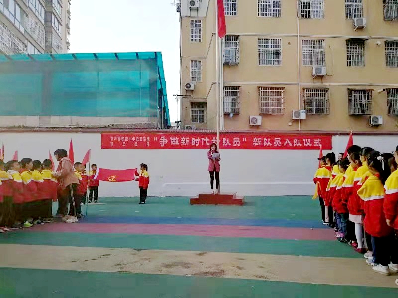 整个仪式庄严而有序,隆重而简朴。嘹亮的队歌在校园回响,鲜艳的红领巾在胸前飘扬。蔚蓝的天空下,队旗、红领巾分外艳丽夺目,映红了孩子们的笑脸。