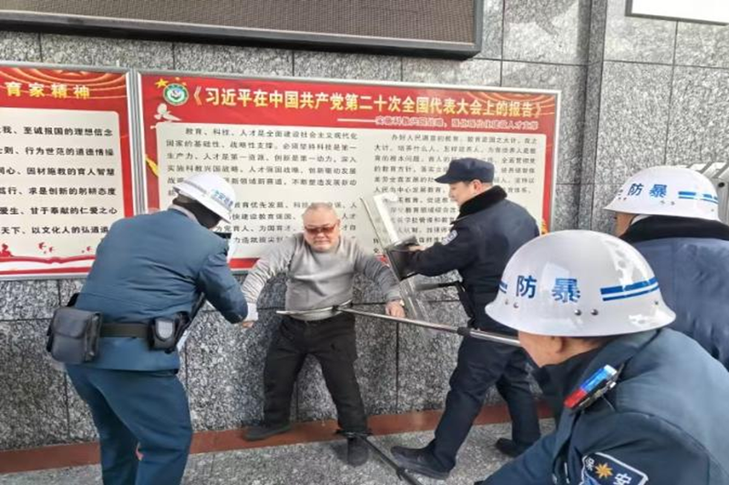 演练模拟上课期间,有一名不法分子妄图强行进入校园,保安人员发现并上前阻止,不法分子手持刀具与安保人员对峙。与此同时,安保人员立即启动一键报警装置,喻校长迅速将情况上报至王校长。在安保人员三人小队的密切配合下,最终将不法分子制服,随后民警赶到学校处置并带走不法分子。