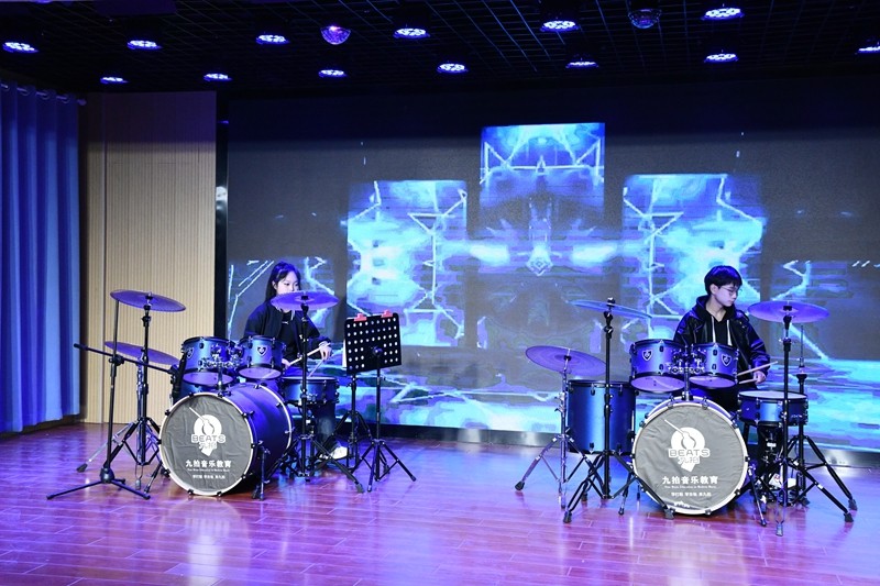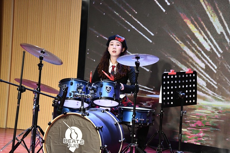 教师们的表演同样精彩绝伦。《大写的中国》和《我的南方北方》以豪迈与细腻的笔触,分别描绘了祖国的辽阔疆域和南北风光,共同彰显了爱国情怀,弘扬了时代精神,极大地激发了师生们的民族自豪感。丁琰琰老师深情演绎的《漫步人生路》,以及与工会主席刘新宇携手合唱的《知否》,圆润的和声令人陶醉,将现场气氛推向高潮。从旋律悠扬的《苹果香》到充满美好祝愿的《2025 要幸福》,从展现教师携手共进的《教师阵地联盟》到洋溢青春活力的舞蹈《复古 disco》,教师们用多才多艺的表演展现了他们的风采与热情。师生同台演绎的架子鼓《离别开出花》和《逆战》,节奏激昂,激情四溢,令现场观众热血沸腾。而在古筝曲《丰收锣鼓》中,老师挥毫泼墨,学生指尖跳跃,共同勾勒出一幅丰收的喜悦与艺术和谐交融的美好画卷。