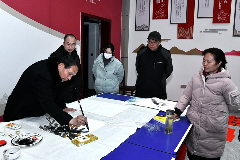 随后,写春联、画国画活动紧锣密鼓地展开。活动现场,艺术志愿者们紧扣春节和企业文化主题,挥毫泼墨,激情创作。一幅幅精美的山水、花鸟画跃然纸上,或清新雅致,或雄浑壮阔,展现出艺术家们深厚的艺术功底和对生活的美好期许;一副副春联笔走龙蛇,或刚劲有力,或飘逸灵动,传递着新春的吉祥与祝福。县观赏石协会会长张波及其他公司负责同志全程陪同观赏,现场气氛热烈,赞叹声、欢笑声此起彼伏。