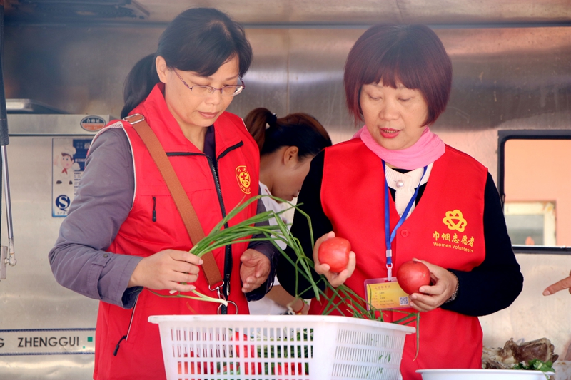 志愿者们动手参与午餐加工