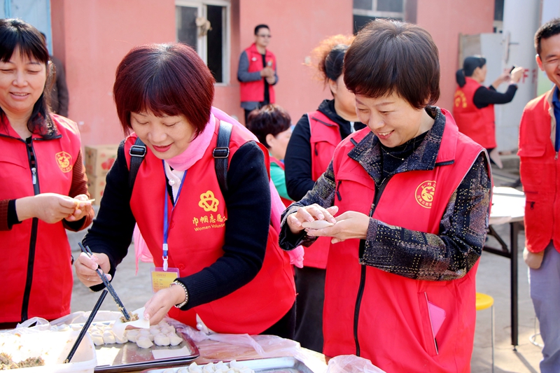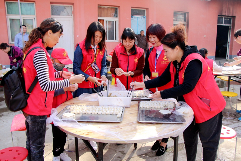志愿者们为老人包饺子