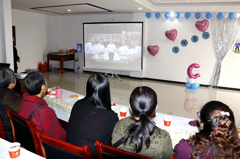 此次重阳节活动分为教工联谊和家园共育两种形式。教工联谊在园长致辞中拉开序幕,她首先代表园里向家属长辈们致以节日的问候,感谢他们对幼儿园各项工作的支持,祝愿老人们健康长寿。并带领家属一起观看《童话传奇》园所宣传片,向她们介绍了园所文化和办园理念。