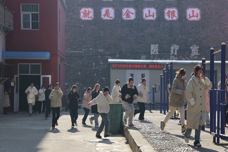 演练涵盖火灾逃生与灭火器使用教学环节。火灾警报响起,学生们在老师的指导下,迅速用湿毛巾捂住口鼻,弯腰低姿,从宿舍有序撤离至操场安全区域,展现出良好的应急响应能力与组织纪律性。