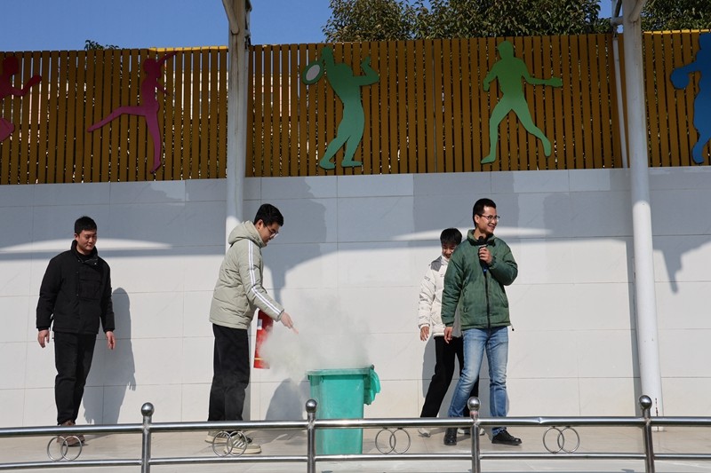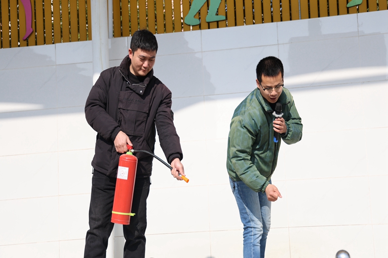 在灭火器使用教学环节,沈新鑫老师现场详细讲解并示范了灭火器的正确使用方法,包括检查压力、握持喷管及瞄准火源根部喷射等关键步骤。学生们认真学习后,部分同学及教官亲自操作实践,成功掌握了灭火器使用技巧,提升了应对初期火灾的能力。