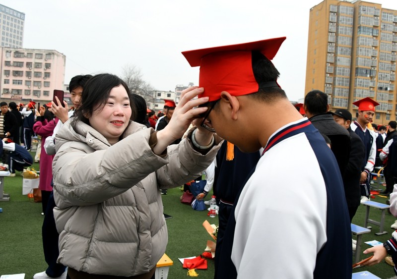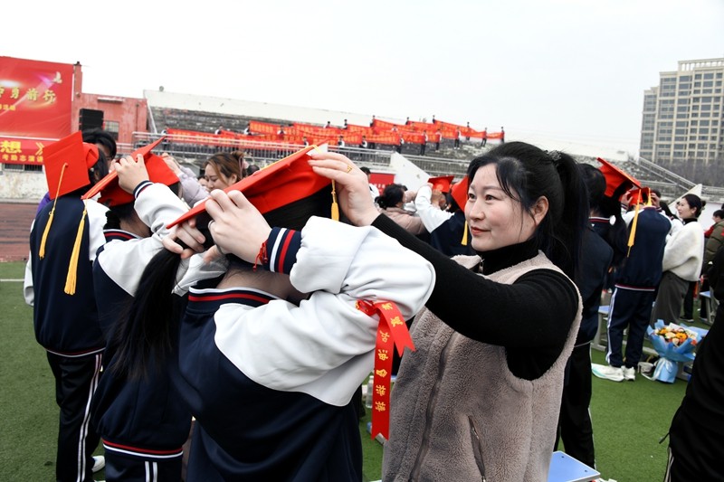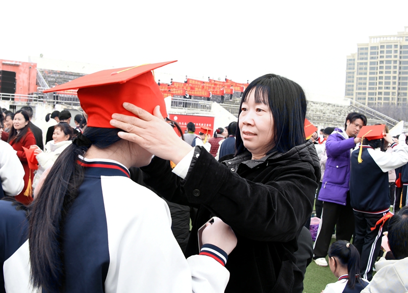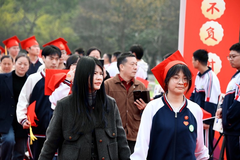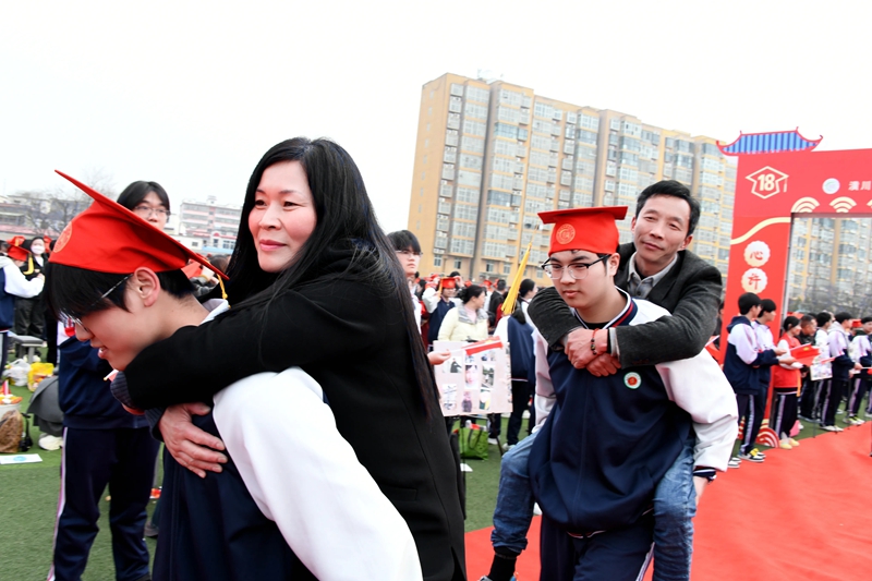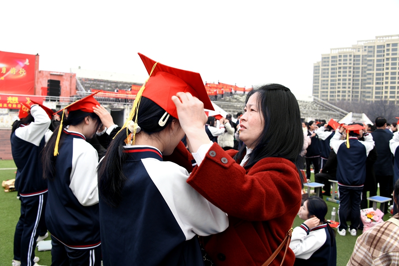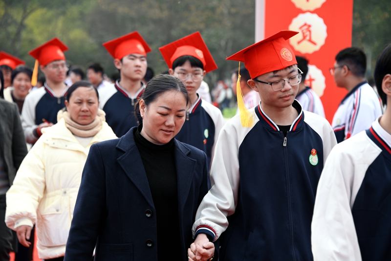 最后,家长和学生手牵手,依次迈过“成人门”“成才门”。高二年级优秀学生代表分列两侧,挥舞红旗,高呼祝福口号,为学长学姐们送上最真挚的祝福与喝彩,现场气氛热烈而感人。