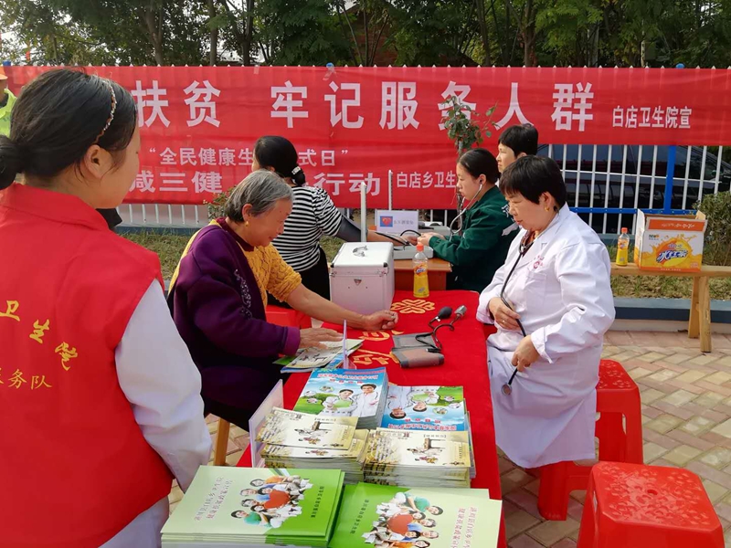 在活动现场,来自白店乡卫生院的医务工作者免费为群众测量血压、发放健康知识手册,受到群众热烈欢迎。