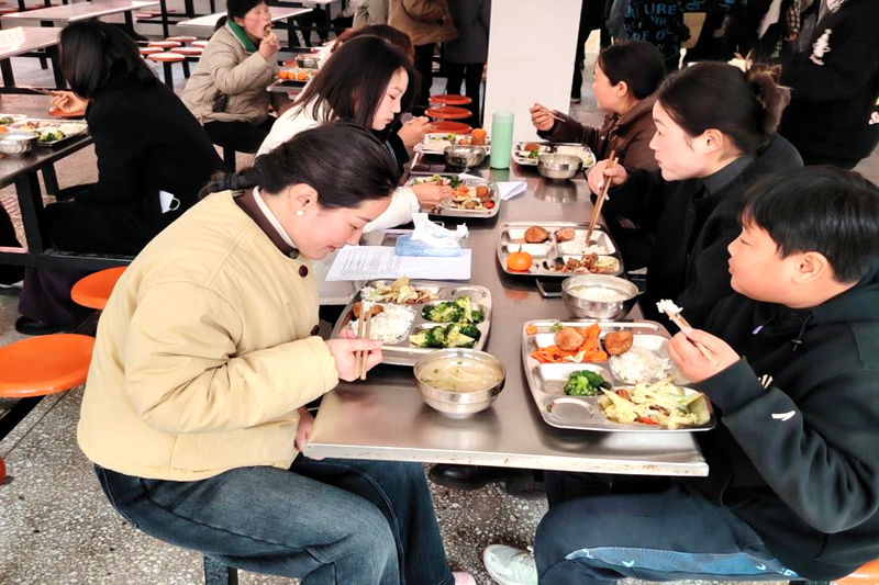 旁边的家长也频频点头:“校长陪餐制让我们更安心。这说明学校领导重视孩子们的饮食,愿意和孩子们吃一样的饭菜,共同保障食品安全。而且听说学校还优先聘用我们在校生家长作为食堂从业人员,这真的太贴心了,让食堂工作更能了解我们家长和孩子的需求。”