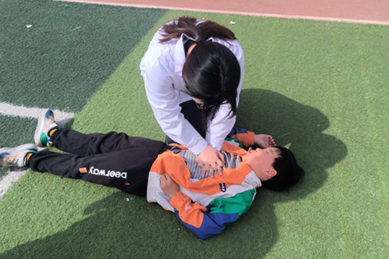演练模拟了学校操场大课间场景,一名学生在活动过程中突然晕倒。班主任反应敏锐,即刻停止集体活动,一方面迅速向学校应急领导小组报告情况,另一方面紧急联系校医。同时,值日教师迅速行动,有序组织周边学生撤离至安全区域,并持续维护现场秩序,有效防止了恐慌情绪的扩散。