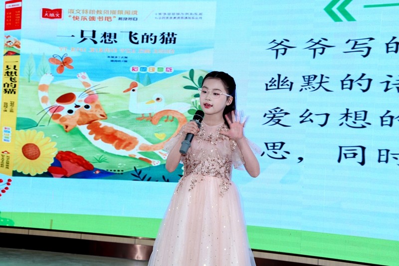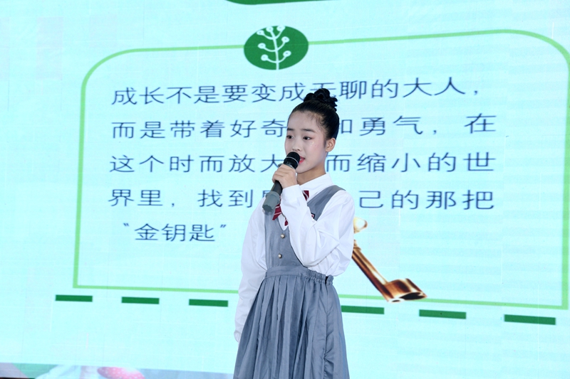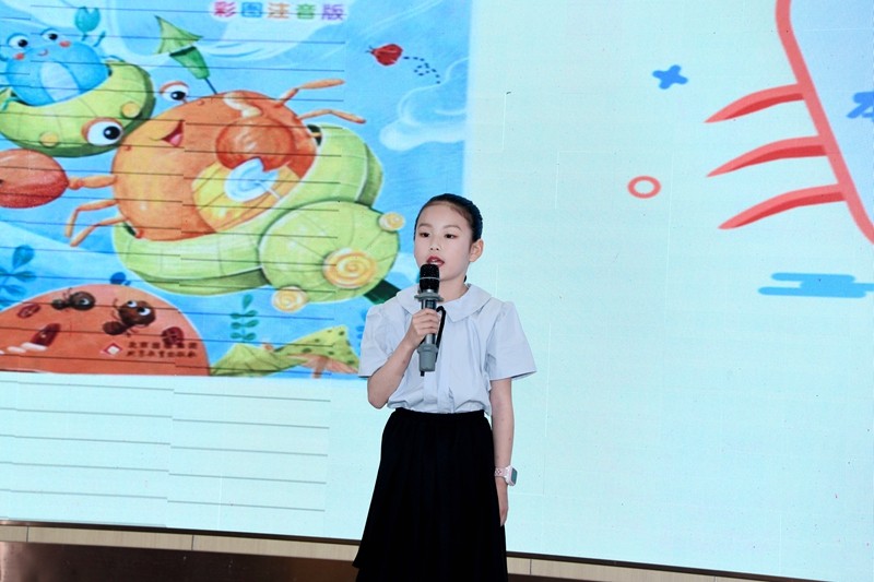 一本本书籍如万花筒的“棱面”,在孩子们的分享中旋转出世界的万千姿态。小选手们用稚嫩而坚定的声音,讲述与书相伴的点滴:或是在《昆虫记》中探寻自然奥秘的冒险,或是从《假如给我三天光明》中汲取的生命力量。思想的火花在交流中迸发,成长的智慧在倾听中沉淀,整个会场洋溢着“共读共悟”的热烈氛围。