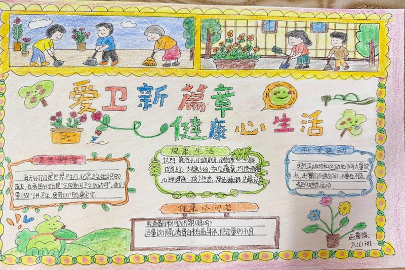 此外,同学们充分利用课余时间,发挥创意与才华,精心绘制“爱卫新篇章 健康‘心’生活”主题手抄报。他们发挥创意,将卫生知识与艺术表现相结合,用色彩鲜明的画面、生动有趣的文字,诠释着对爱国卫生运动的深刻理解。