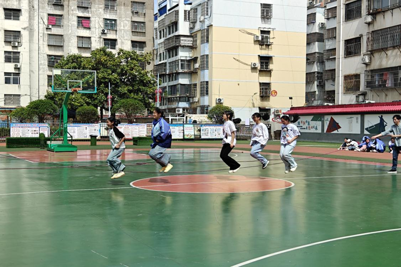 七(1)班和七(2)班在比赛中表现出色。比赛中,摇绳员精准把控节奏,参赛队员连贯跃动。尤其在第三轮混合组对决中,两队顺利完成高难度加速跳,赢得全场掌声,最终以总次数优势获胜。七(3)至七(6)班虽未取得好成绩,但展现了团队精神。场边未参赛学生自发组成“节奏指挥团”,用拍手声为队友助力。比赛中途有队员鞋带松脱,同组伙伴立即协助整理,这些细节展现出班级温度。七(7)班和七(8)班始终秉持着“友谊第一”的高尚原则。当对手班级在比赛中出现摇绳卡顿的情况时,他们主动暂停自己的练习,给予对手充分的尊重。比赛接近尾声时,尽管他们暂居落后,但全班同学依然以整齐响亮的口号,为本班最后一组队员加油鼓劲,直至最后一秒。