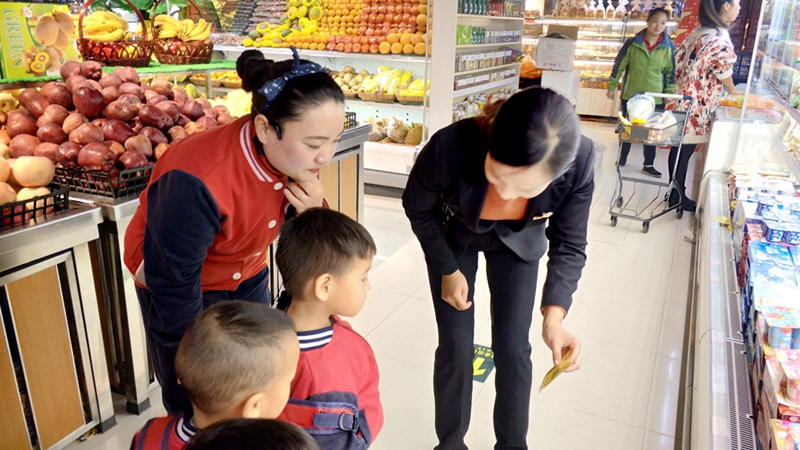 超市购物对孩子来说并不陌生,但自己挑选商品、自己结账还是头一回,大家充满了好奇和兴奋。只见超市门前的空地上老师在认真的清点人数,跟大家做着活动介绍,细细的讲解着规则以及需要注意的安全细节。
