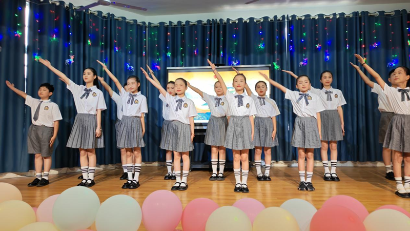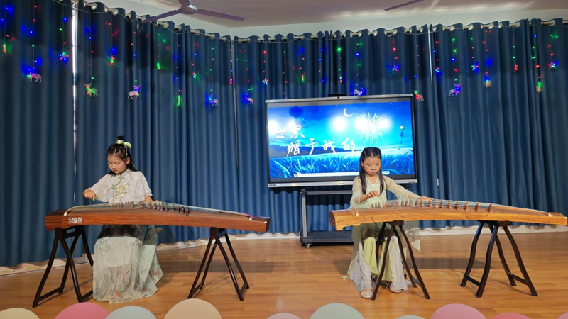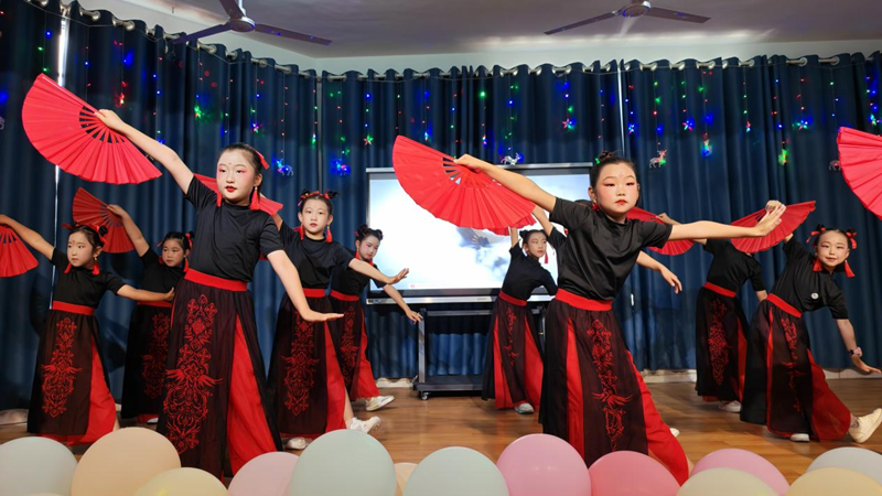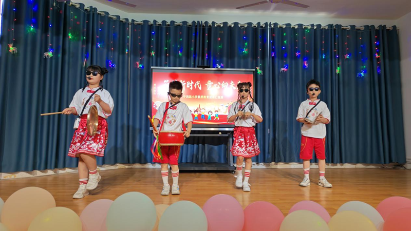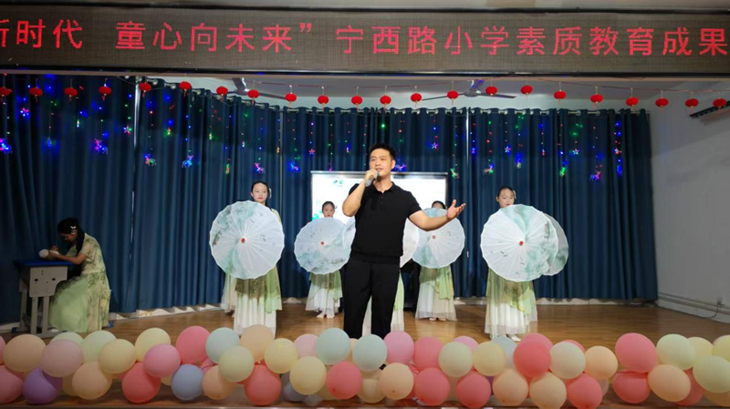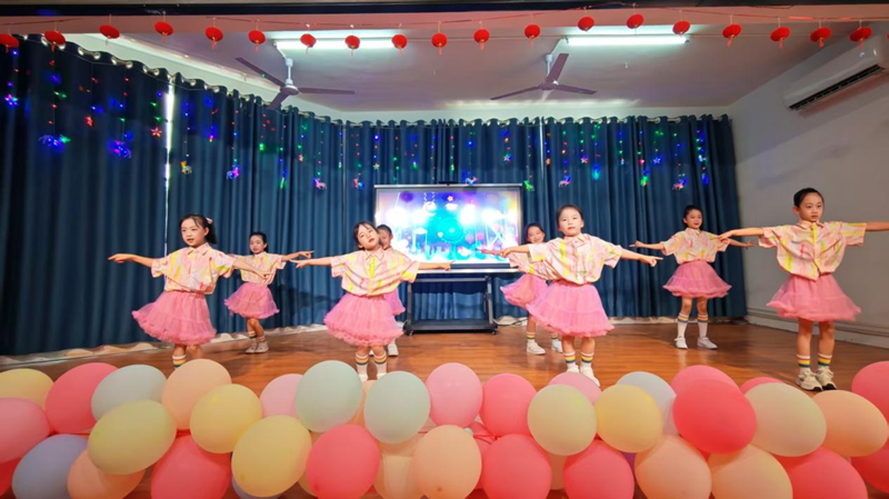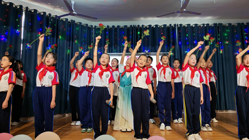 活力四射的开场舞《当哈利遇上Honey》瞬间点燃全场热情。随后,各班级和社团精心准备的12个节目轮番登场。扇子舞《雪龙吟》以灵动的舞姿演绎中国风韵,展现了传统与现代的融合之美。朗诵《跟着课本游中国》,孩子们用清脆的嗓音带观众领略祖国山河,感受华夏文化魅力。古筝曲《世界赠予我的》琴声婉转,诉说着对世界的感恩。脱口秀《我家的六一计划》以天真烂漫的语言引发了全场观众的阵阵笑声。小小球员们的花样篮球表演活力十足,精彩技巧赢得观众们连连喝彩。音舞诗画《青花瓷》,教师和学生同台演出,以舞绘瓷、以诗传韵,把演出推向了高潮。葫芦丝社团的孩子们带来的《打水姑娘&婚誓》带领观众感受民族音乐的温度与情怀。英语情景剧《邓小平赔碗》创新演绎历史故事,传递诚实守信的宝贵品质。舞蹈串烧《活力四射》充分展现出新时代少年的青春朝气。三句半《庆六一》,锣鼓声中妙语连珠,童趣十足。在亲子节目《我们一起成长》中,学校四组教师家庭携手登台演出——她们既是讲台上辛勤耕耘的园丁,也是生活中温柔慈爱的母亲,通过诵读与歌声传递亲情与陪伴的力量。