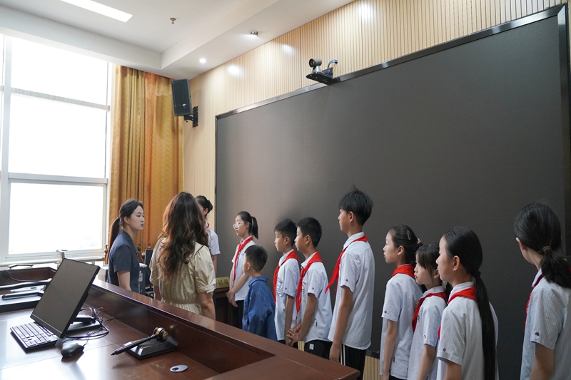 活动伊始,同学们怀揣着好奇与期待,在法院干警的带领下,首先走进了庄严肃穆的审判法庭。刑事审判庭干警化身“法治导游”,用通俗易懂的语言介绍了法庭的布局,象征公平正义的法徽、庄重的审判席、严谨的书记员席、控辩双方席位以及旁听席。同学们兴奋地触摸象征司法权威的法槌,了解其“一槌定音”的意义。