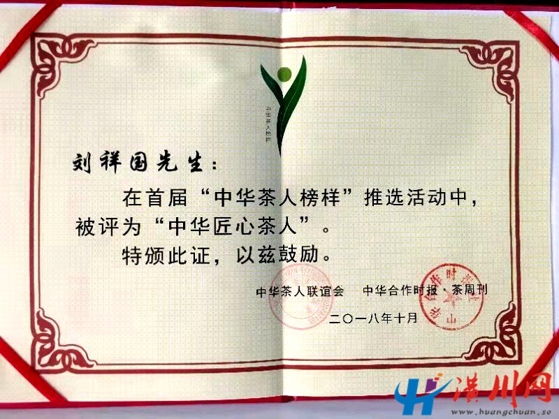 为感谢默默耕耘、无私奉献、勇于创新、具有高尚情操的新时代茶人,近日,由《中华合作时报·茶周刊》承办的“中华茶人榜样”推选活动,河南潢川县光州茶业有限责任公司董事长刘祥国作为河南省唯一入选者,荣获“中华匠心茶人”称号。活动自2018年2月份启动以来,引起全国茶人及在海外推广中国茶文化的华人的高度关注,共有来自全国各省、市、自治区、港澳台地区和日本、韩国、马来西亚、比利时等国家的200多名茶人参加。