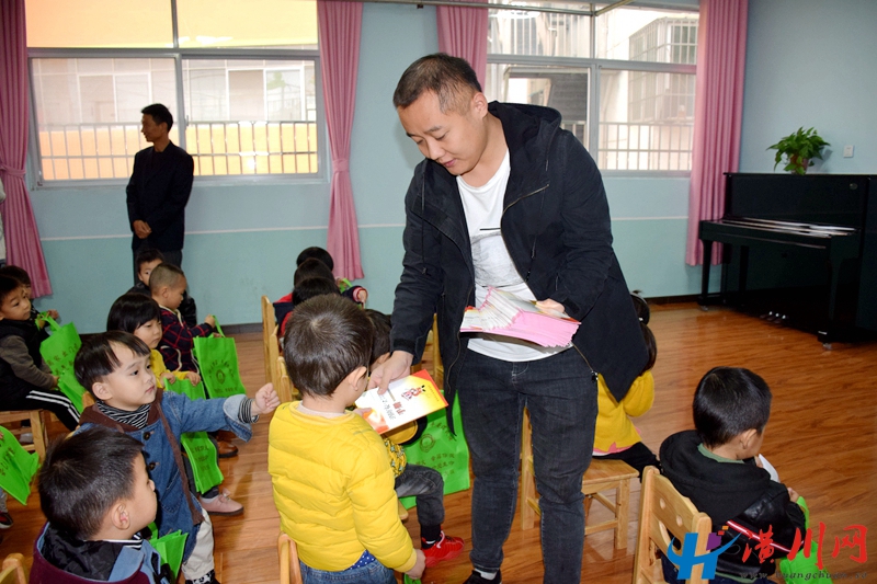 消防队员为幼儿发放消防安全宣传册