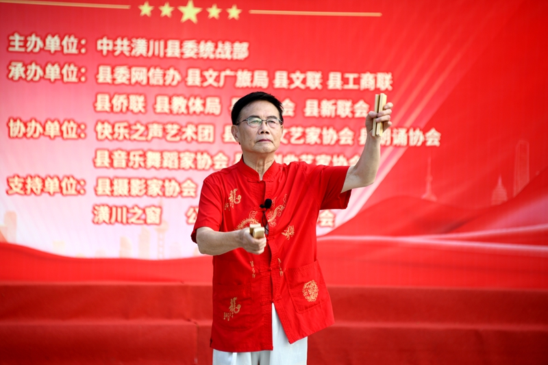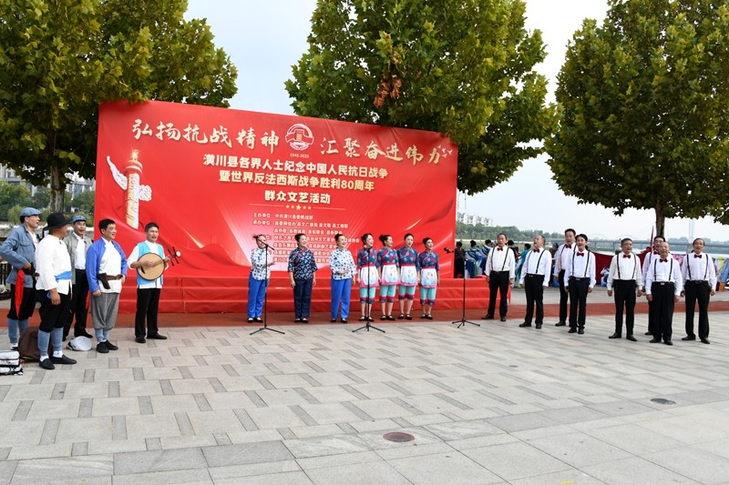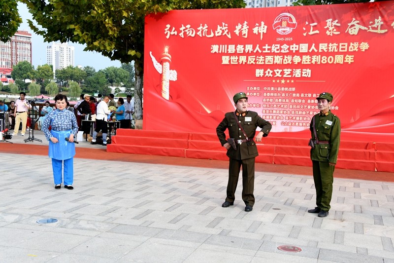 4时许,活动在铿锵有力的《黄河大合唱》中正式拉开帷幕,唱出了中华民族不屈的怒吼;歌曲《英雄大别山》《潢川颂》轮番唱响,前者歌颂大别山儿女的革命壮举,后者礼赞新时代潢川的发展变迁,两首歌曲一今一昔、一脉相承,抒发了对脚下热土的深情热爱。县朗诵协会选送的情景朗诵《乳娘》温情上演,演员们以细腻的表演,还原了抗战时期沂蒙乳娘“用乳汁哺育革命后代、用生命守护希望”的感人故事,不少观众热泪盈眶,生动诠释了“军民一家、生死与共”的鱼水情。县少数民族界带来的朗诵《挺起全民族抗战的潢川脊梁》格外引人关注。演员以潢川本地抗战历史为蓝本,讲述了各族群众不分你我、携手抗敌的真实事迹。京剧《沙家浜·智斗》选段经典重现,展现了革命者的机智与坚定;快板书《潢川抗击日寇赞歌》以本土曲艺形式颂扬了1938年国共两党团结抗日、保卫潢川的英雄历史,引发了强烈的共鸣。