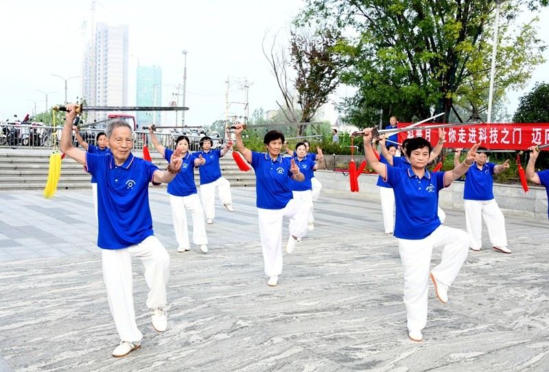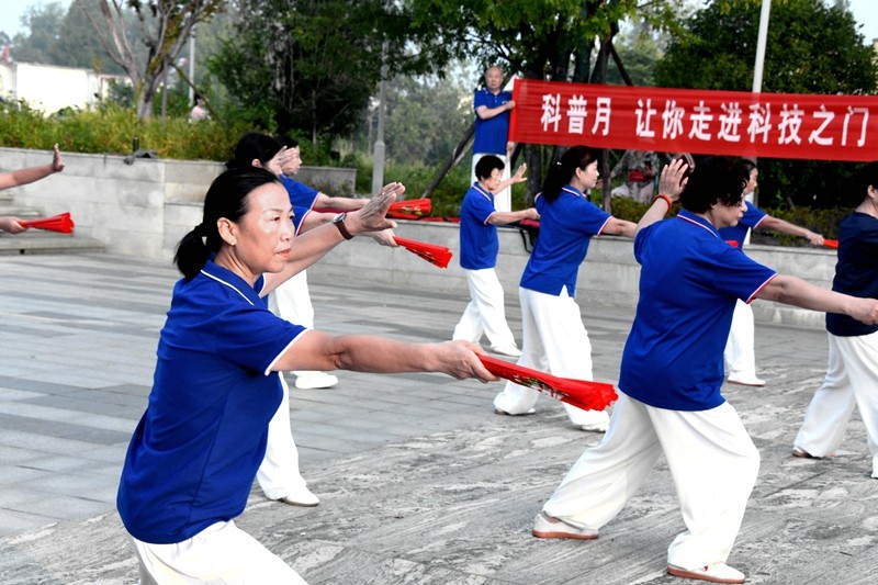 本网讯 9月3日清晨6时许,由县老科技工作者协会主办,潢川老年大学、县杨澄甫式太极拳学会及快乐之声艺术团联合承办的“潢川县社会团体纪念抗战胜利八十周年暨潢川县科普宣传月展示活动”在红玺公园旁举行。县老年科技工作者协会常务副会长苏振国,潢川开放大学、老年大学支部书记李莺,县杨澄甫式太极拳学会会长李厚同,快乐之声艺术团团长张旭升,以及杨澄甫式太极拳学会春申君广场辅导站、老年大学辅导站、清水湾社区辅导站的拳友们和快乐之声艺术团艺术家们参加了此次活动。