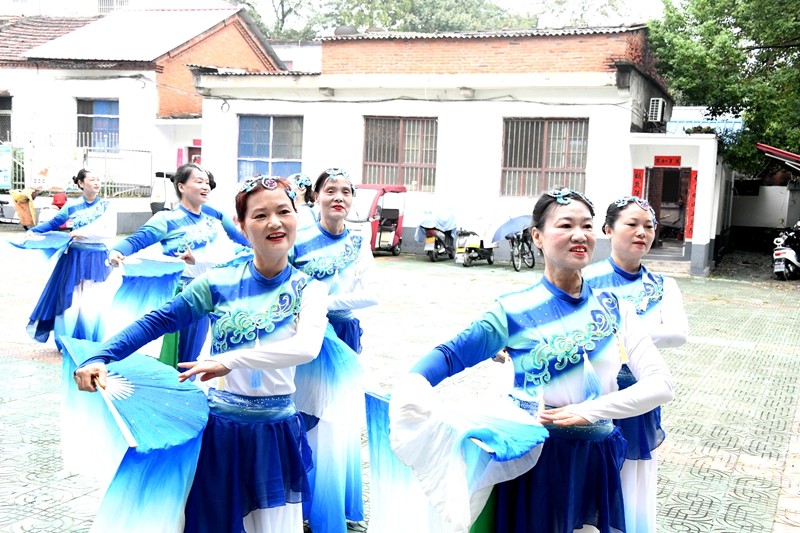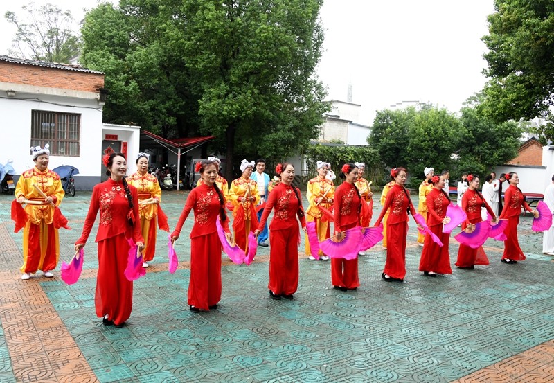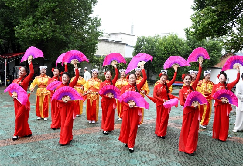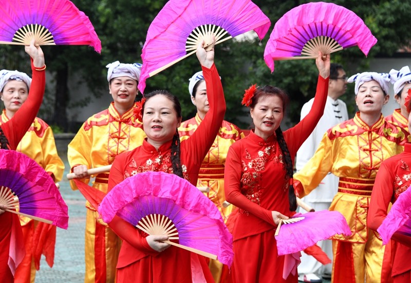 伴随着欢快热烈的节奏,快乐之声艺术团带来的《火绫子》表演拉开了活动序幕,灵动的舞步与激昂的旋律瞬间点燃全场。随后,各参演团体依次登场,呈现了一场集科学性与艺术性于一体的健身文化盛宴。杨澄甫式太极拳学会的拳友们先后展示了精编杨式太极拳24式、杨式太极十三刀、杨式太极剑以及36式杨式太极扇,动作行云流水、刚柔并济,充分展现了太极文化的深厚底蕴与科学健身的独特魅力。快乐之声艺术团则通过非遗快板《潢川明天更美好》、光州快书《百善孝为先》和舞蹈《一条大河》等节目,巧妙融合地方文化特色与积极健康的生活理念,赢得现场观众阵阵掌声。