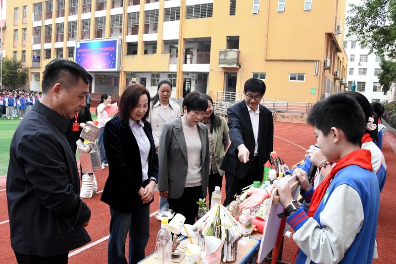 活动现场还集中展示了近千件学生科技作品。同学们充分利用废旧塑料瓶、易拉罐、纸箱、光碟等日常材料,发挥创意、变废为宝,制作出旋转电风扇、小台灯、托马斯小火车、塑料花盆栽等生活用品与工艺作品。每一件作品都凝聚着孩子们的巧思与智慧,吸引领导与师生驻足欣赏,赞叹不已。