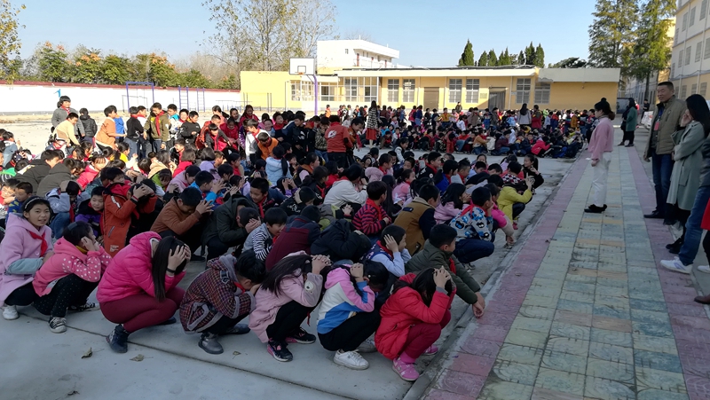 下午2:50点,警报声响起,孩子们在老师沉着冷静的指挥下,掩住口鼻、弯腰伏背,按照预定的安全逃生路线,快速而有秩序地通过安全通道,撤离教学楼,疏散到操场等安全地带集合。耗时3分钟 ,随着各班老师清点人数,并层层上报,全校1000余名师生全部安全疏散完毕,孩子们双手抱头蹲在空地上,静静地等待警报声解除。