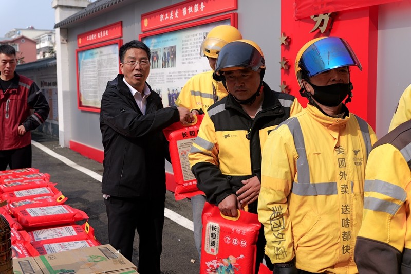 本网讯 为切实关怀新业态劳动者群体,推动其加入工会组织,让他们真切感受到党委政府与工会组织的温暖,近日,潢川县总工会精心组织新业态劳动者“暖新礼包”慰问活动,为快递员、外卖配送员等新业态劳动者送上关怀与实用物资,以实际行动践行“服务职工、关爱职工”的初心使命。