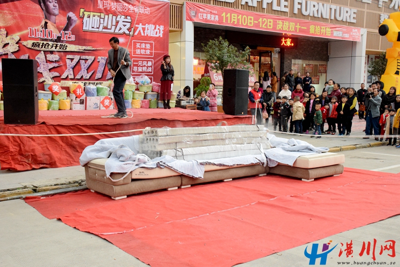 潢川网11月12日讯(李斌 实习生 高原)时值一年一度的购物狂欢节,为了答谢新老客户的厚爱,11月11日下午,潢川县红苹果家具欢快举行“决战双十一 砸沙发,大挑战”活动,新老客户共同见证皇玛梦丽莎沙发品质。
