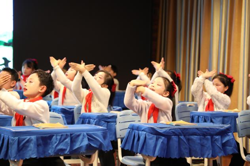 比赛现场,课桌成了孩子们创意表达的“伙伴”:二(1)班率先登场,将古诗《江南》的温婉韵律与《少年有志》的蓬勃朝气相融合,孩子们轻拍课桌的节奏里,既有江南水乡的柔美手势,又有少年昂首的昂扬动作,刚柔并济的表演瞬间点燃现场氛围;一(4)班的《赠汪伦》+《天地龙鳞》更显巧思,古诗里的送别温情与歌曲中的家国情怀碰撞,稚嫩的动作里藏着满满的诚意;二(2)班的《二十四节气歌》+《乡间的小路》则把节气知识揉进律动,舒展的肢体如同春日枝叶般鲜活,让课桌舞多了几分生活意趣。