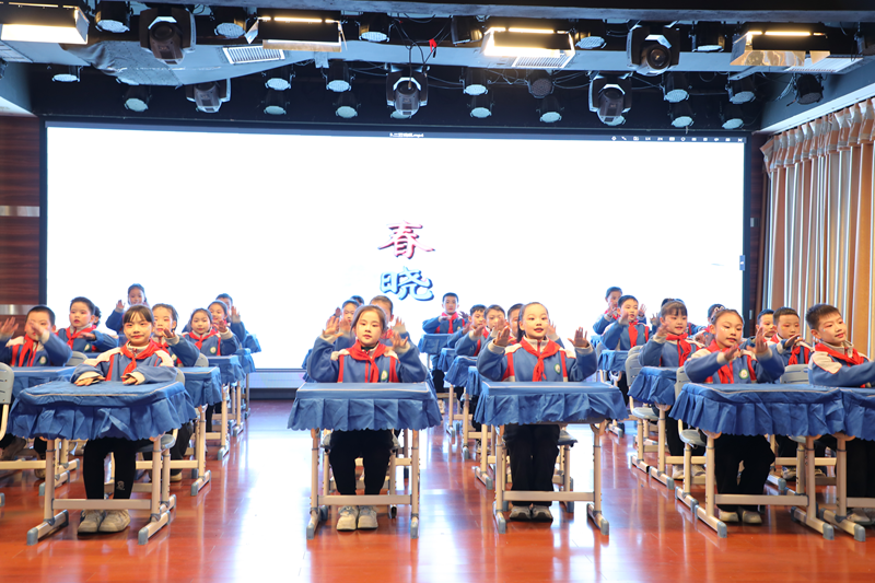 不同年级的节目各有亮点:一年级的表演自带“童趣”,一(1)班的《画》+《小猪佩奇》,把古诗意境和卡通形象的俏皮结合,轻晃的脑袋、蹦跳的手势让现场充满童真;二年级的节目则更显韵律融合,二(5)班《春晓》+《梦想家》里,孩子们随“春眠不觉晓”的吟唱轻敲桌面,又在“我是梦想家”的旋律中舒展手臂,把春日生机与少年志向揉进了每一个动作里。