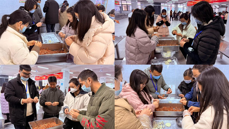 活动现场暖意融融,热闹非凡。家长志愿者们化身 “指导老师”,手把手教学生擀皮、包馅、捏形,指尖翻飞间,一个个形态各异的饺子应运而生;同学们热情高涨,在模仿与尝试中感受动手乐趣,与同伴分工协作,与家长温馨互动,欢声笑语弥漫整个餐厅。教职工们也积极参与其中,与师生、家长共同包饺子,拉近了彼此距离,营造出家校同心、师生同乐的和谐氛围。
