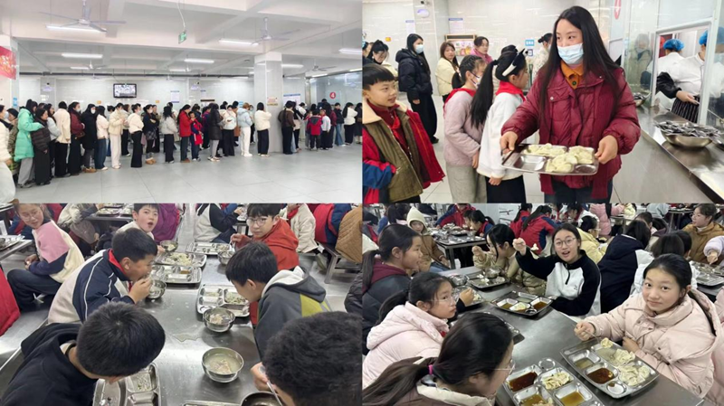 包饺子环节结束后,各班将精心包制的饺子整齐摆放展示,造型美观、大小匀称的成品赢得阵阵称赞。随后,各班将饺子交由食堂工作人员煮制,家长们在参观了整洁规范的学校后,与学生一同在餐厅就餐,品尝亲手包制的饺子,共享劳动成果,暖意与幸福感在舌尖蔓延。
