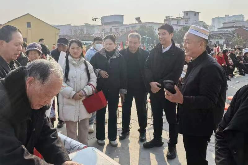 本网讯 为弘扬中华优秀传统文化,丰富群众精神文化生活,增进民族团结,营造喜庆祥和的节日氛围,2025年12月19日上午,潢川县老城街道办事处在南海社区民族团结进步广场举办“迎春纳福传温情 民族团结贺新春”免费书写赠送春联活动。县委统战部副部长、民族宗教局局长邵勇,老城街道党工委书记李川及县文联、县书法家协会相关领导,各民族书画艺术家、文艺工作者和辖区各族居民群众共同参与了此次活动。