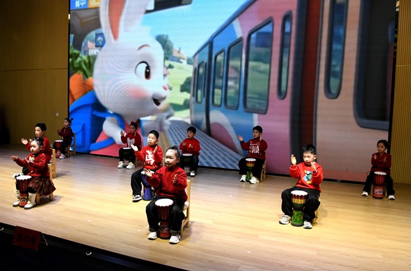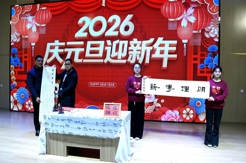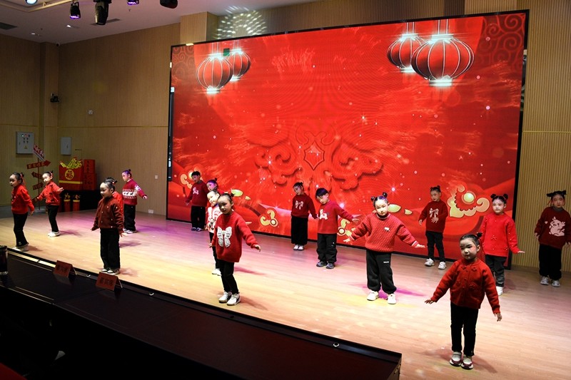 活动分为两个阶段。第一阶段的文艺展演在演播大厅温情上演。大二班小朋友带来的舞蹈《福气娃娃》,孩子们身着喜庆服饰,动作萌态可掬,将童真童趣与新年祝福融为一体;随后,星光幼儿园有限公司总经理赵迅、园长刘青青先后致辞,向到场嘉宾、家长及师生致以诚挚的新年问候,回顾幼儿园发展历程,展望马年美好蓝图,言语间满含对孩子们健康成长的期许与祝福。教师集体舞《中华全家福》以优美的舞姿展现了教职工队伍的活力与凝聚力,传递出家国同心的温情;大三班的非洲鼓表演《鳄鱼先生开火车》节奏明快、充满动感,孩子们用稚嫩的鼓点奏响欢乐乐章,赢得现场阵阵掌声。书法家熊愚现场挥毫泼墨,为孩子们书写不同字体的“福”字,并向星光幼儿园赠送了“明理传薪”等寓意深远的书法作品。