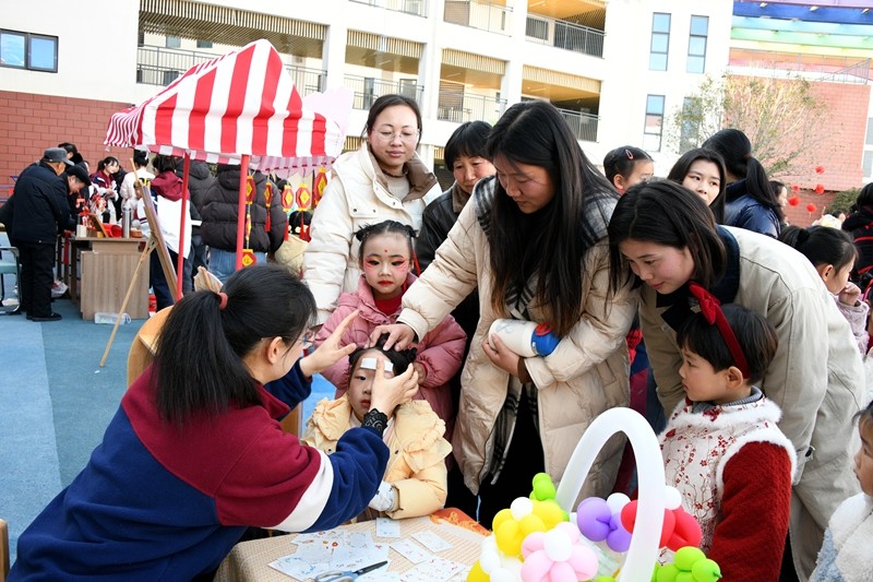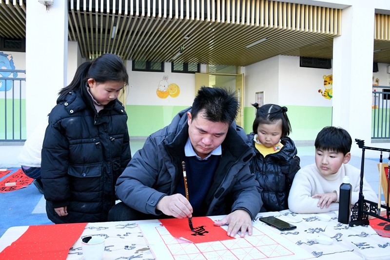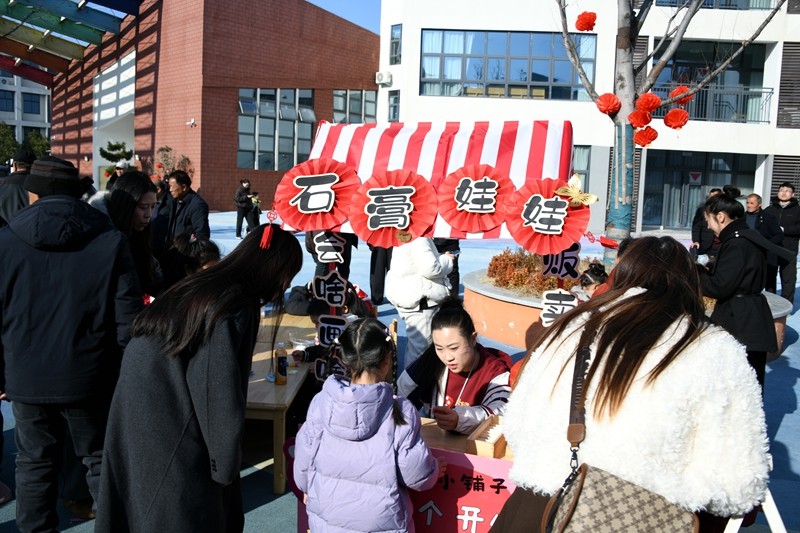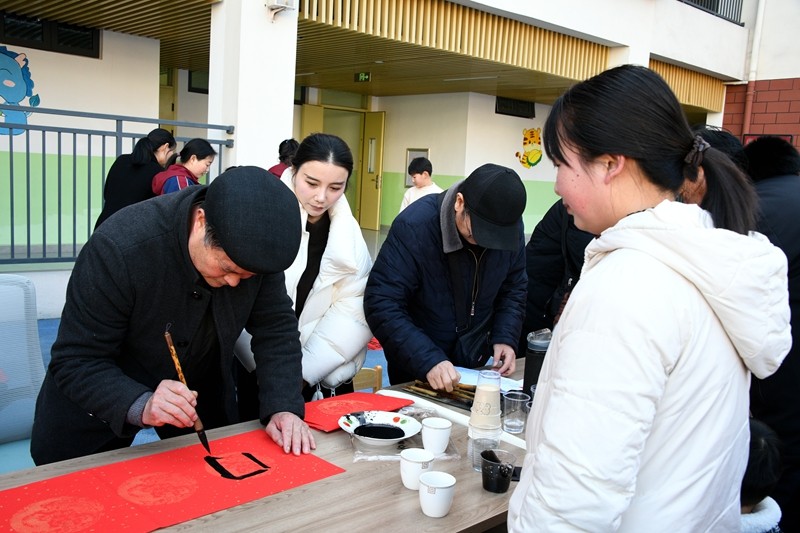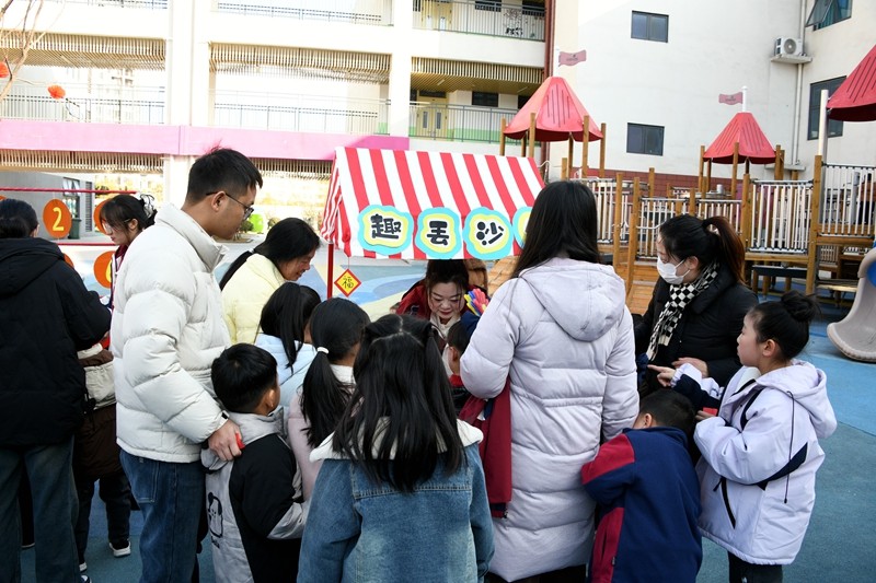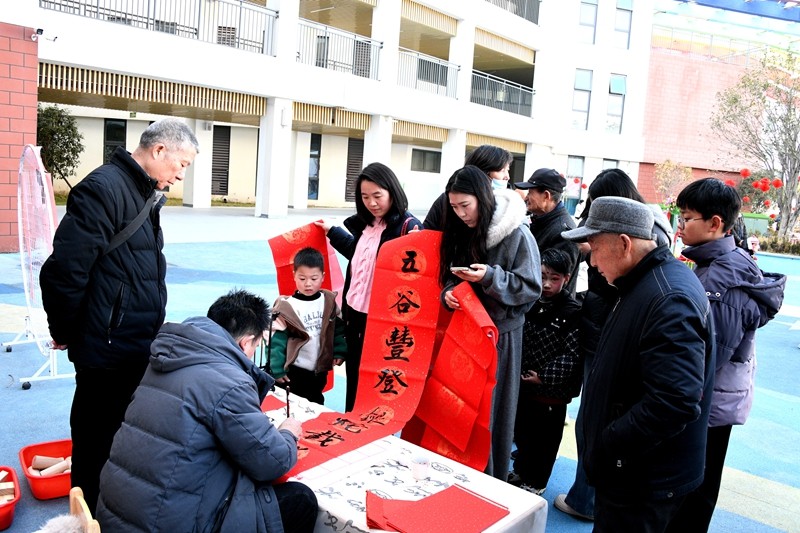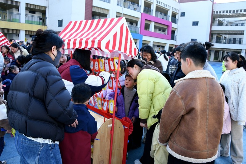 文艺展演结束后,活动进入备受期待的第二阶段——“萌娃趣赶集”。幼儿园操场瞬间化身热闹非凡的民俗集市,投壶、套圈、猜灯谜、蒙眼敲鼓等趣味游戏摊位前人头攒动,孩子们在家长的陪伴下踊跃参与,尽情体验传统游戏的乐趣,欢呼声与喝彩声此起彼伏。特别设置的写对联摊位前,书法家们现场挥毫,笔走龙蛇间,一副副寓意吉祥的春联与大红“福”字新鲜出炉,墨香四溢中让师生与家长近距离感受中华书法艺术的魅力,孩子们也纷纷提笔尝试,在笔墨中传承文化基因。惊喜十足的“红包雨”环节更是将集市氛围推向小高潮,一张张承载着好运的红包让孩子们笑容满面,收获满满。