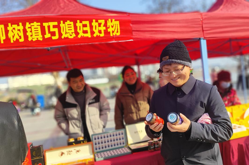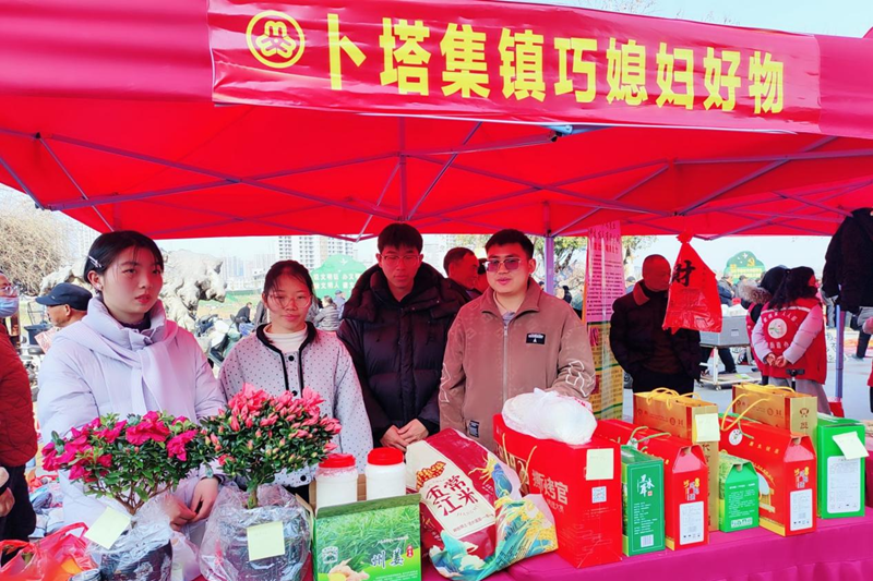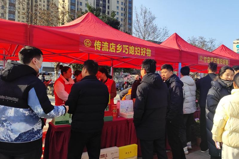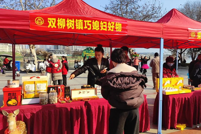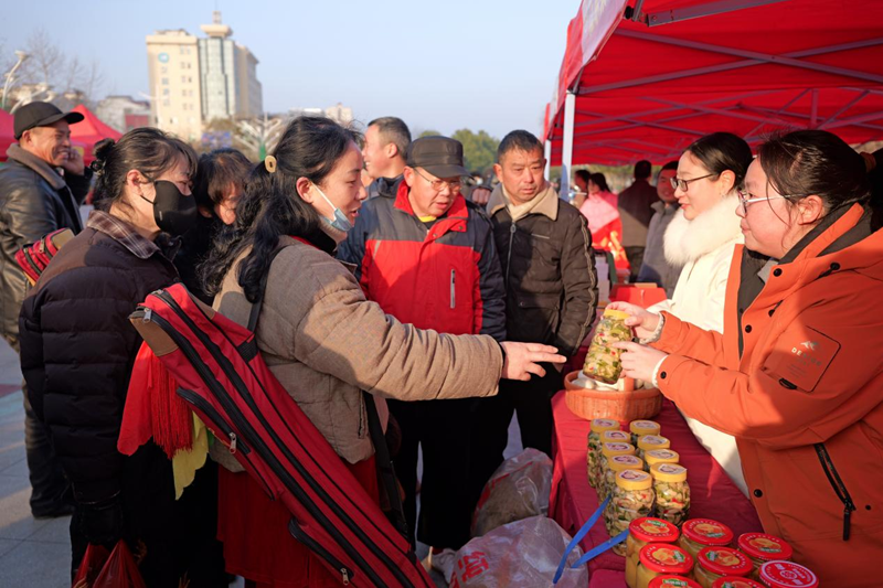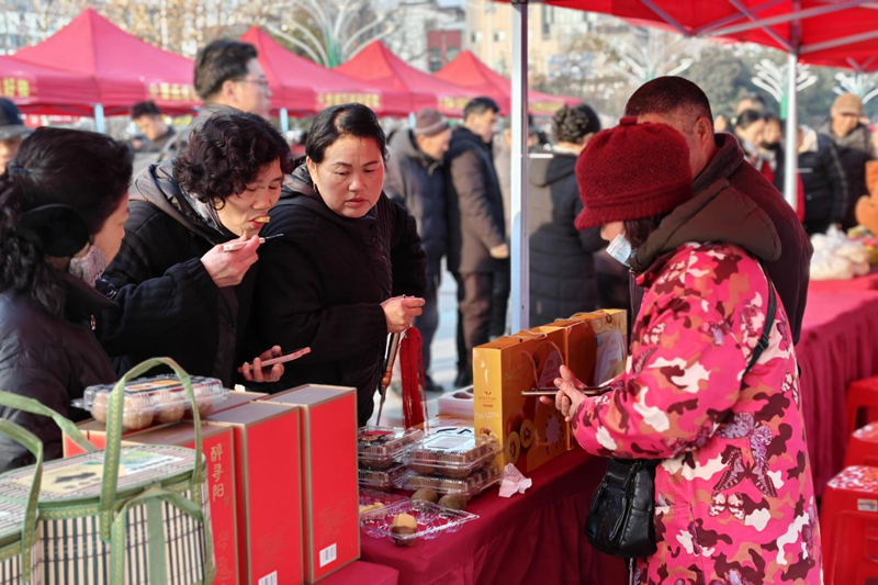 活动现场,一个个展位前人头攒动,巧媳妇们热情推介自家产品。展销区里,传承古法工艺的潢川贡面细如发丝、莹润通透,藏着老潢川的烟火底蕴;老字号手工捶制的绿豆糍粑咸香软糯;地道腊鸡腊肉悬挂售卖,色泽红亮诱人、风味醇厚;原生态土鹅蛋个头饱满,一口解锁自然本味;手工酿造的梨酒、蓝莓酒萃取鲜果精华,酸甜交织、任人品尝。此外,新鲜虾稻米、品质茶油、带着泥土的果蔬、寓意吉祥的各色花卉、兼具匠心与文化底蕴的非遗手工艺品、民俗制品错落陈列,品类丰富、琳琅满目,缀满新春喜气。每一件好物都凝结着巧媳妇们的指尖智慧与朝夕辛劳,既实现了群众“一站式囤够年味”的心愿,更让乡土烟火与新春欢悦相融共生,氤氲出独属于潢川的新春暖意。