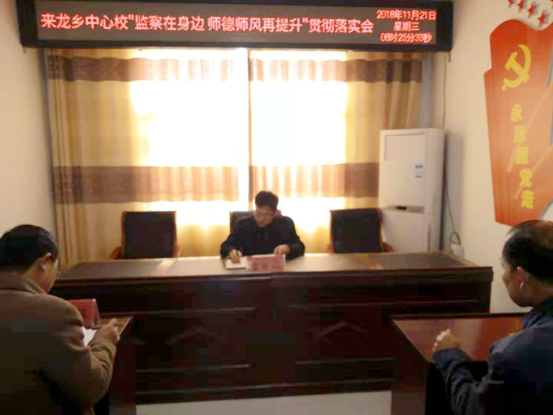 潢川网11月21日讯(陈国栋)为加强师德师风建设,营造来龙乡中心校风清气正的育人环境。贯彻落实好11月15日潢川县“监察在身边师德师风再提升”工作总结暨违规办班补课专项整治大会精神,潢川县来龙乡中心校于11月21日上午召开了“监察在身边师德师风再提升” 贯彻落实专题会。