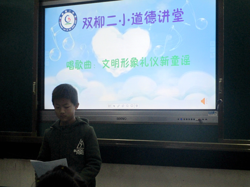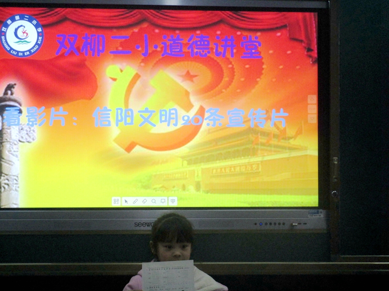 道德讲堂活动由六个方面组成:一、唱歌曲:文明形象礼仪新童谣;二:观影片:信阳文明20条宣传片;三、讲故事:文明在身边;四、谈感悟:文明的力量;五、做承诺:新时代,讲文明,好少年,树新风。懂礼仪,在言行,好习惯,贵养成;六:讲党课:扶贫助困在路上。