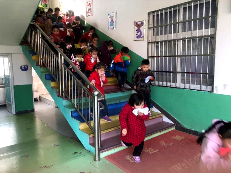 2点30分,伴随着紧急警报声响起,演练开始。各班教师快速按消防预案的疏散线路带领幼儿拿起湿毛巾,捂住口鼻,弯腰小步快走,分两道楼梯紧急有序下楼。途中,孩子们冷静、有序、并快速撤离到操场安全地带。全园从听到警报到安全集合约用了1分20秒的时间,途中无发生任何意外。