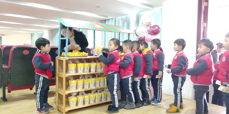 孩子们在教师的组织下有序的进入五楼“电影售票处”独立进行购买电影票,选购零食,购票结束后孩子们在教师的引导下有序的来到检票口,相应的工作人员进行检票盖章。通过检票后孩子们根据电影票的号码找到相应的座位号进行对号入座。