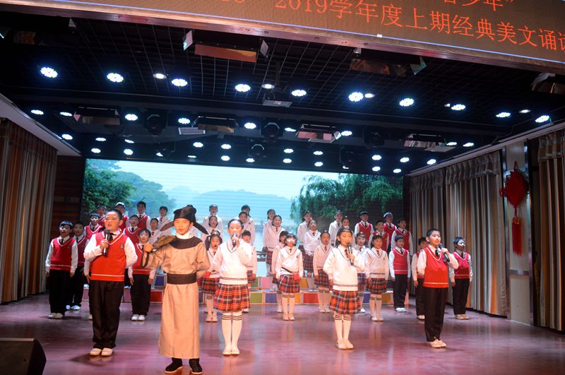 比赛每班有必选美文和自选美文两种,必选为课内,自选为课外。共有来自三、四年级的8个班级以团体形式参加。参赛班级分别诵读了《少年中国说》、《游子吟》、《黄河颂》、《水调歌头》、《我爱你中国》、《感恩的心》等经典美文。各班团体人数多,阵势大,着装整齐美观,加上阵型和诵读形式编排,表现了班级各自风格。比赛选手都是经过各班语文老师的精心指导,同学们的认真准备,在比赛时都发挥出了自己的朗读水平。在朗读作品时,选手们神情专注,激情投入,或抑或扬,或喜或悲……都读得那般自然、那般妥帖,他们那清晰标准的吐字、质朴悦耳的声音、自然丰富的面部表情再加上恰如其分的肢体语言,把评委老师和在座的同学们引入了一个个不同的情景之中。学生的精彩表现,赢得了在场师生的阵阵掌声。