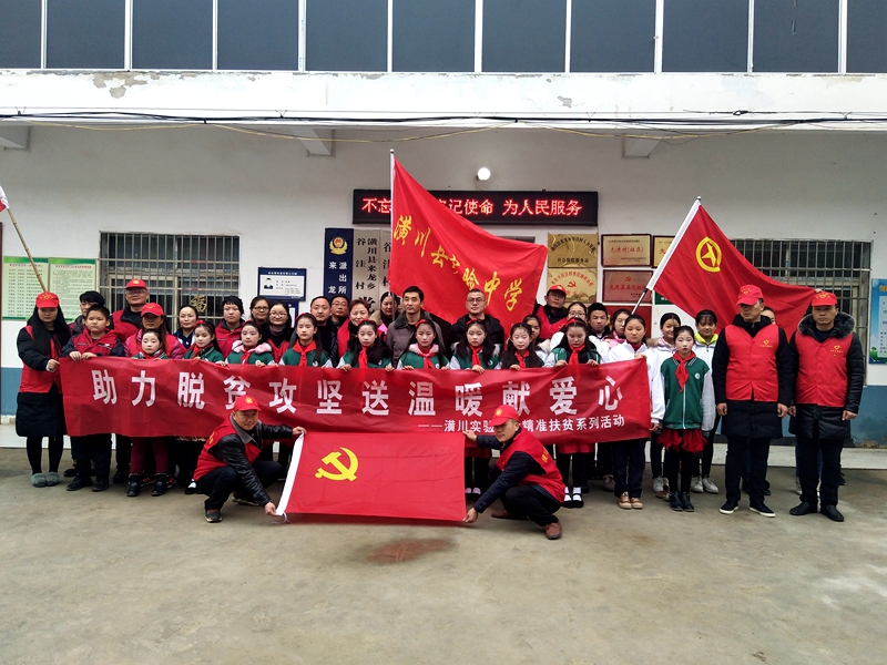 潢川网12月21日讯(甘贵芝)天蓝蓝,水清清,红旗之下是一家。12月21日,在校团委的组织下,潢川县实验中学共青团和少先队组成的志愿队到来龙谷洼村小开展“圆梦微心愿”助力脱贫攻坚活动。随行的有校长吴德云、副书记宋仕强、副校长熊小键等领导和鹿鸣文学社的三名小记者。
